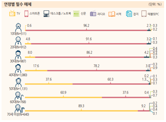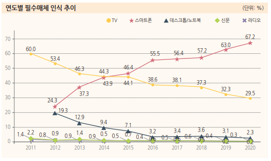 그러나 연도별로 필수 미디어 인식 추이를 보면 TV는 지속적으로 감소하는 반면 스마트폰의 필수 미디어 인식은 지속적으로 증가하는 추세를 보입니다.