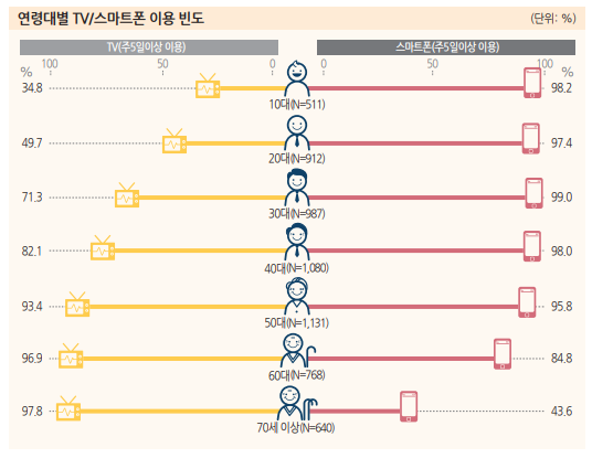 2020년 방송매체 이용행태 조사 자료에 따르면 연령대별 TV 이용 빈도수로 볼 때 50대 이상은 90% 이상에 육박합니다.(더 놀라운 것은 동시에 50대 미만 전 연령대가 스마트폰 이용률을 보면 90% 이상)
