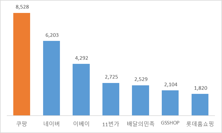 2021년 8월 50대 이상이 가장 많이 결제한 온라인 서비스, 단위: 억원, 출처: https://www.wiseapp.co.kr/insight/detail/76/? 게다가 홈쇼핑의 주 고객인 50대 이상 연령층이 2021년 8월에 결제한 온라인 서비스를 보면 쿠팡, 네이버, 이베이가 절대적입니다. 다행히 7개 순위 중 2개가 홈쇼핑이긴 하지만 홈쇼핑을 다 합쳐도 쿠팡 하나를 이길 수 없다고 생각합니다. 이미 홈쇼핑에서 너무나 당연한 세대인 50대 이상 잠재고객들이 쿠팡의 간편결제 서비스나 초특가가격 혜택 등을 경험했다는 것입니다.