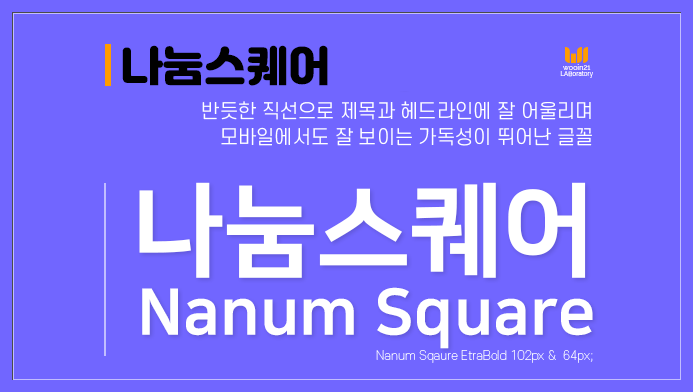 ※ 글씨체의 특징 바른 직선으로 제목에 잘 어울리며 모바일에서도 잘 보이는 글꼴입니다.필요한 2350자만 선택하여 용량을 가볍게 줄여 웹 환경에서 보다 편리하게 사용할 수 있습니다.☞서체의 구성문자를 부착하면 다양한 굵기와 크기로 쓸 수 있습니다.나눔스퀘어Light, Regular, Bold, ExtraBold / 한글 2,350자, 영문 94자, KS약물 986자
