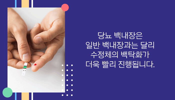 이 과정에서 당뇨병인 분은 고쿨코우스의 농도가 높아져 수정체의 혼탁 현상이 빨라집니다.
