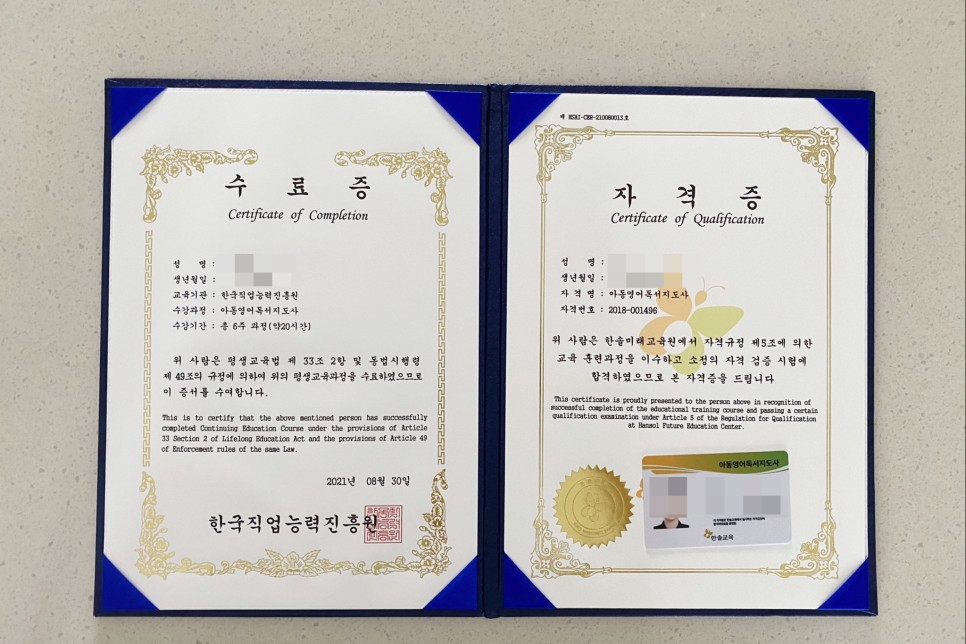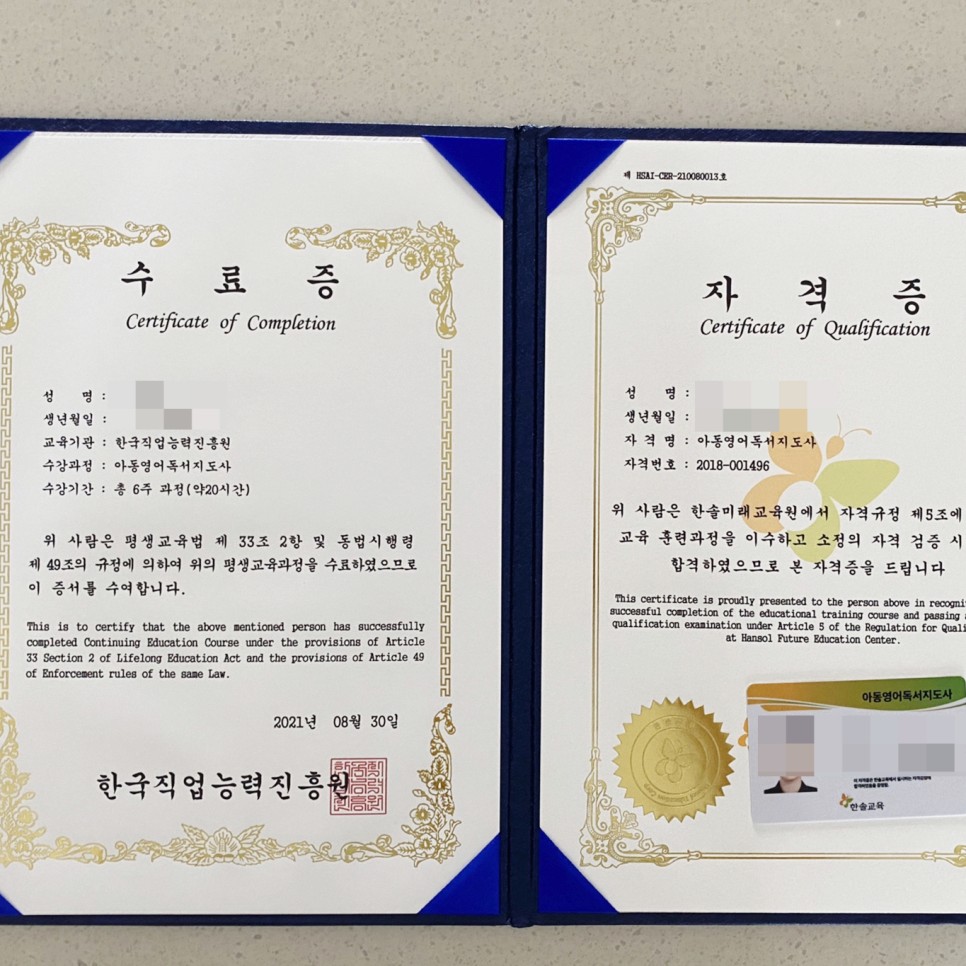 벌써 6개월에 한번씩 자격증 공부를 하고 있어.풍선아트 전문가 1급, 정리수납 전문가 1급에 이어 이번에 취득한 아동 영어독서지도사까지.