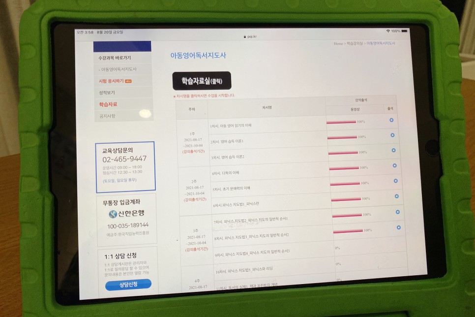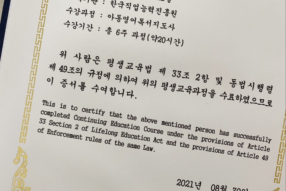 한국직접능력진흥원 평생교육원에 아동영어독서지도사 자격증이 있음을 알고 무료로 수강하기로 했다.아동 영어독서지도사 자격 무료 수강 리뷰