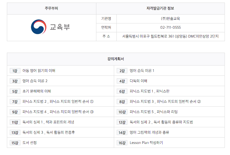 총 16강으로 구성된 아동 영어독서지도사 자격.
