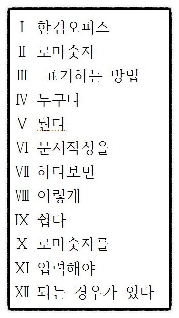 아래와 같이 한컴산 의미 합체에서 로마 숫자가 대문자와 소문자를 입력하였습니다. 대문자의 경우 숫자 1, 소문자의 경우 영문 i 소문자와 유사하여 로마 숫자와의 구분이 명확하게 이루어지지 않습니다.