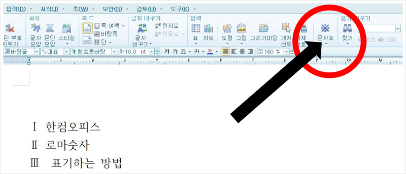 한글로 로마 숫자 입력은 간단한데요. 한글 사무실을 실행하고 메뉴에서 입력 탭 > 문자표를 클릭합니다. 다른 접근법에서는 입력 탭에서 퀵 아이콘 문자표를 누르셔도 되고 단축키 Ctrl+F10 키를 누르셔도 됩니다.