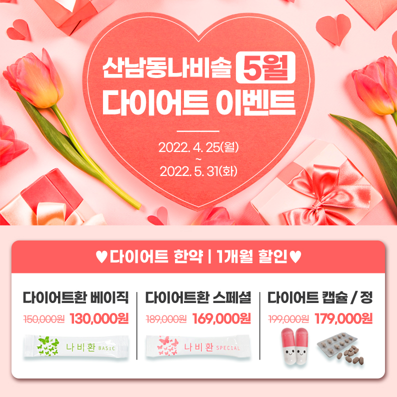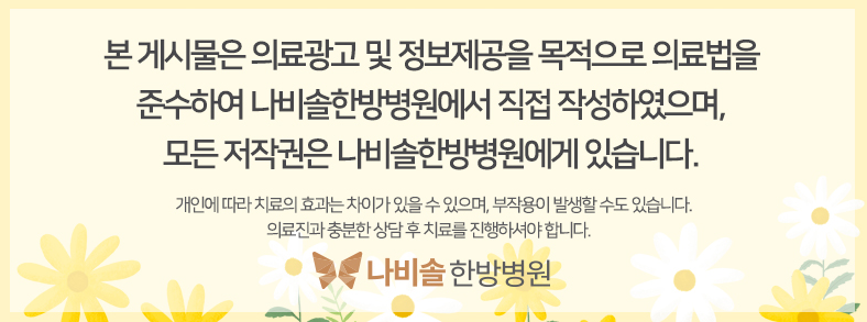 신체 내부의 문제로 비만이 되어 혼자서 다이어트를 진행하기 어려운 부분이 있다면 나비솔한방병원의 한방 다이어트로 비만의 원인을 개선하는 건강한 다이어트를 실천해 보시기 바랍니다.