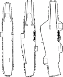 1945년, 57년, 70년 개조 당시 배수량 45,000톤에 프로펠러 전투기 100대 탑재 1955년 개조 후 좌측으로 경사진 착륙용 비행갑판 설치 배수량이 44% 증가한 65,000톤에 제트 전투기 65대 탑재