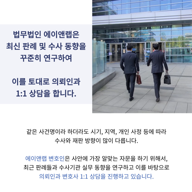 벌금형 선처를 받게 되면서 회사 해고 징계도 면하게 된 의뢰인은 앞으로도 직장인 생활을 이어갈 수 있다는 점에 큰 안도가 생겼습니다. 걱정을 덜고 법정에서 나온 L씨는 자신의 사건을 끝까지 꼼꼼히 다뤄준 김동우 변호사에게 고마움을 전하며 다시 자신의 일상으로 복귀했습니다.법무법인 에이앤랩은 갑작스러운 사건사고로 즉시 자문을 받을 수 있도록