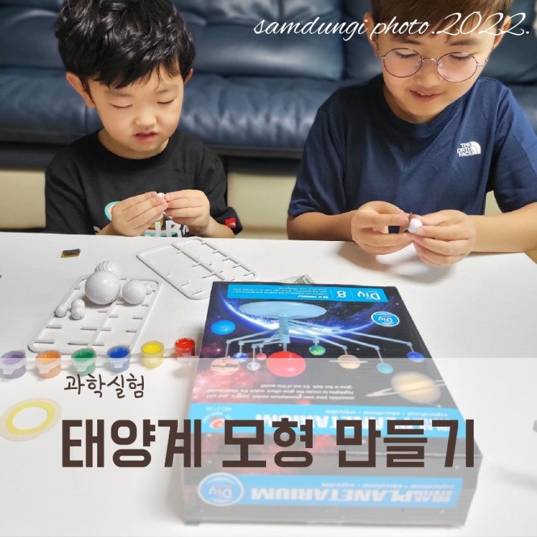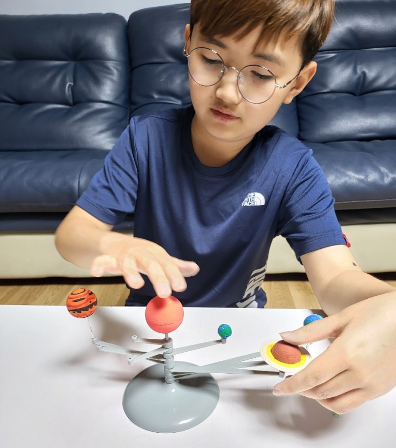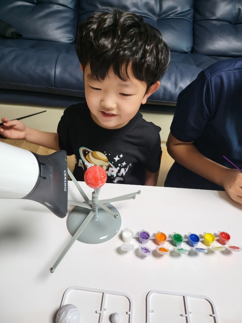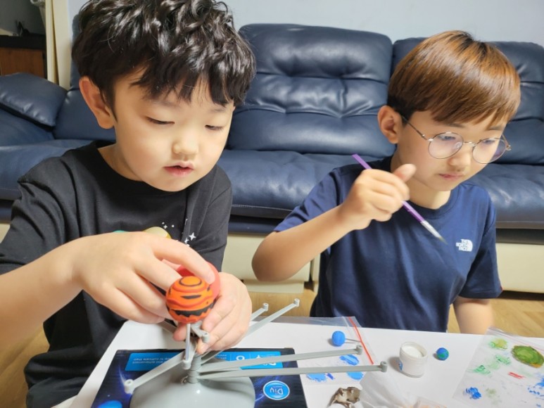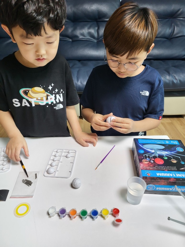 과학실험 키트, 행성 모형 준비로… 7살이나 초등학생 모두 즐겁게 작업을 할 수 있었고 작업하면서 자연스럽게 태양계의 순서, 크기 비교 등 사진을 보면서 이해할 수 있었습니다. 앞으로도 이런 놀이로 통한 수, 과학에 대한 접근을 많이 해야 합니다.^^ 알찬 시간 오늘도 즐겁게 보냈고요.
