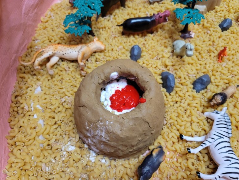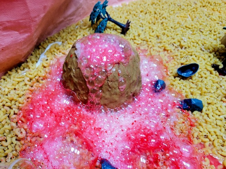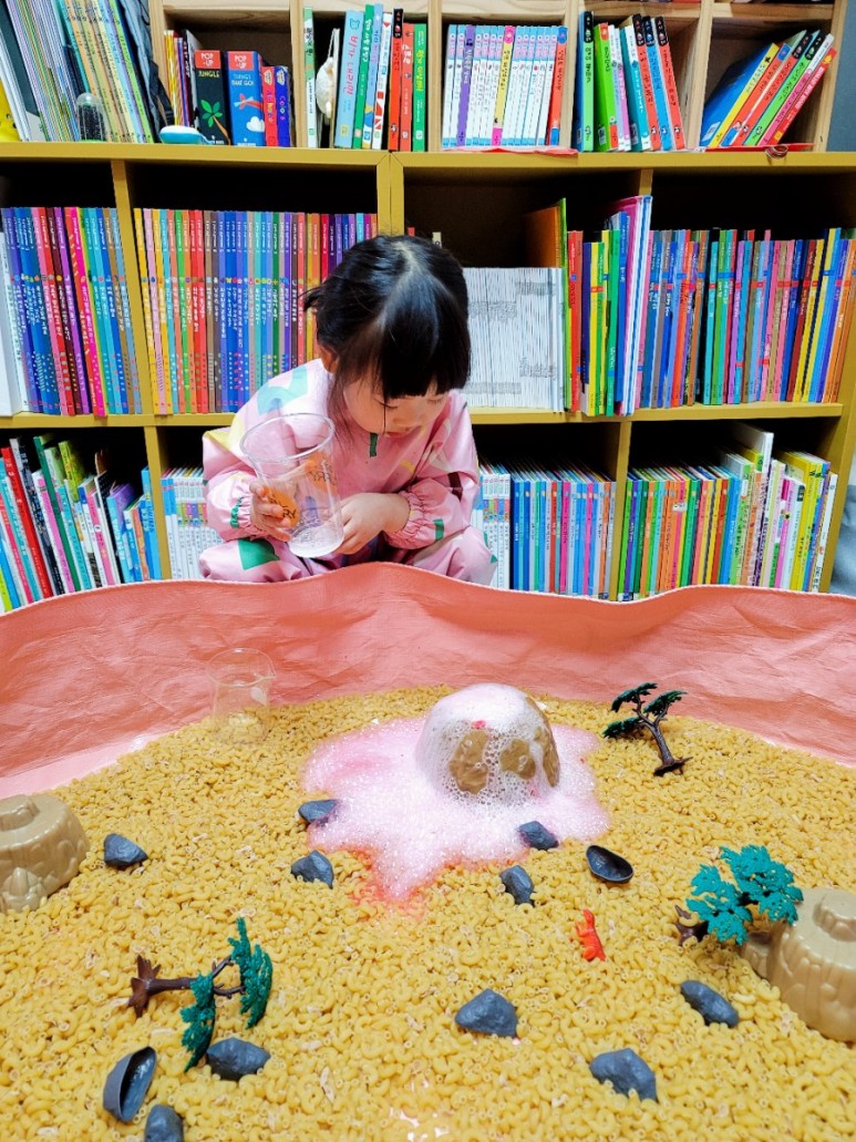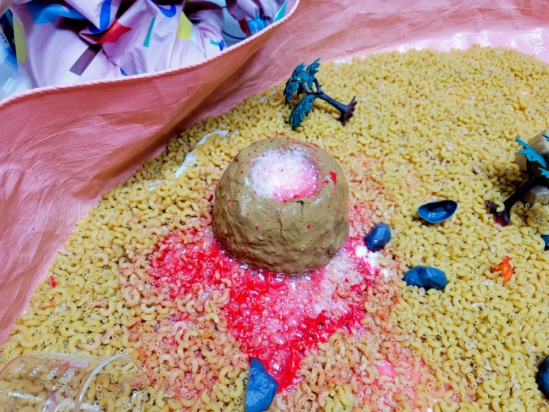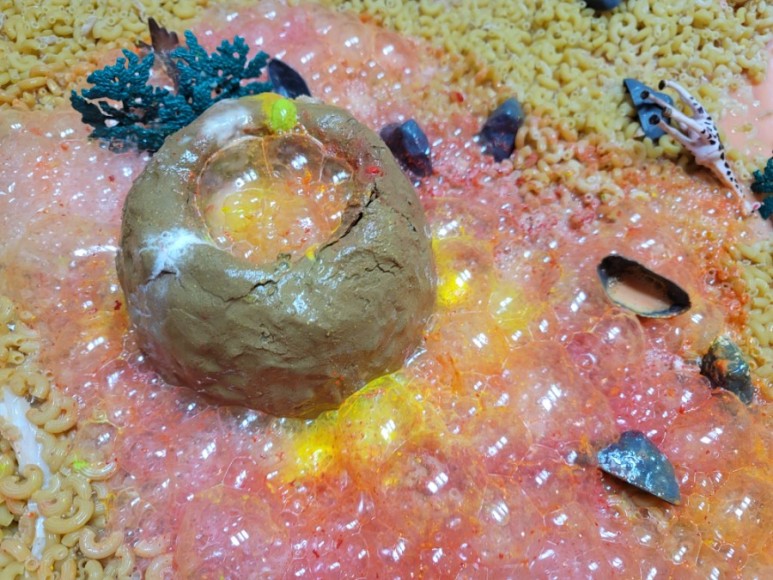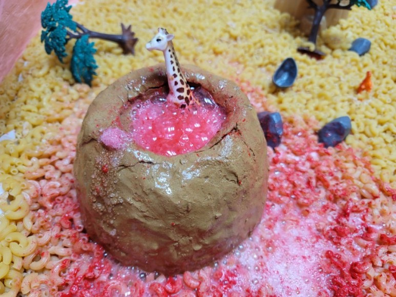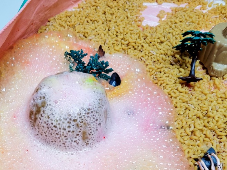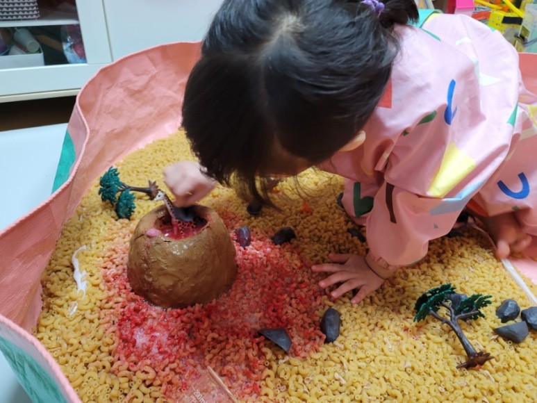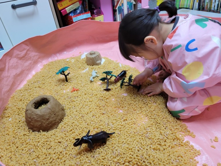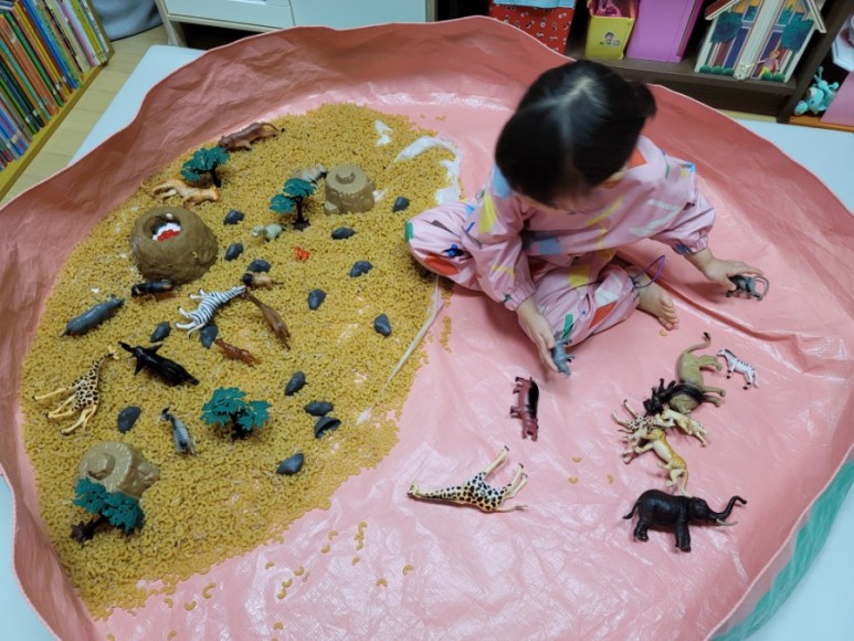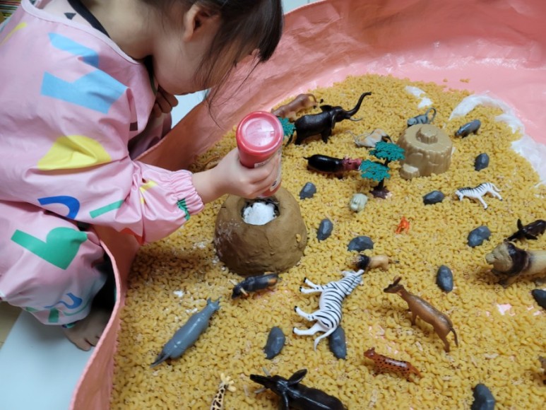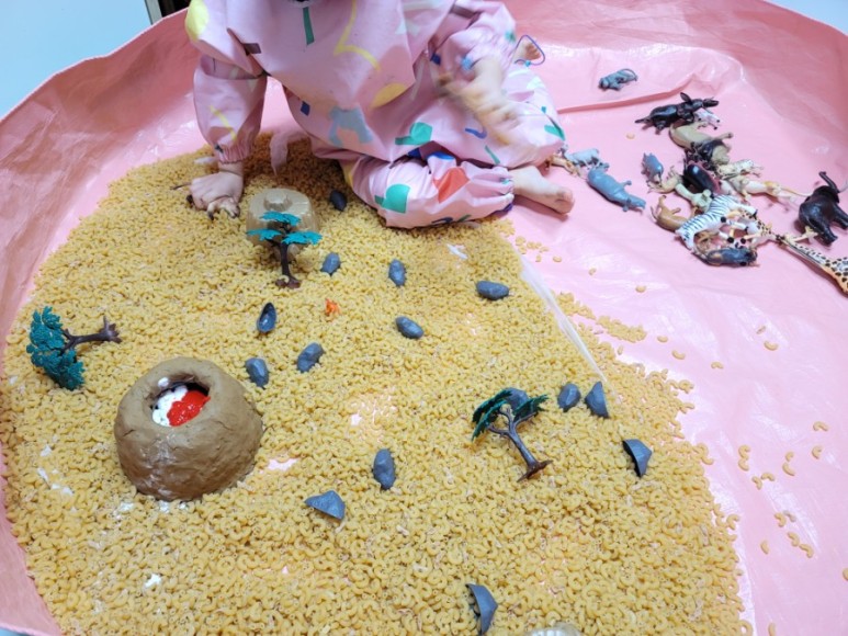 모래 대신 사둔 마카로니 정말 오랜만에 쓰는구나.오늘은 내가 다 써버리고 싶어.마카로니를 모래처럼 깔고 함께 만든 점토 화산을 심어 집에 있는 동물들의 피겨를 데려와 일단 역할놀이를 했다.아, 혹시 몰라서 횟집 비닐을 먼저 한 장 깔았어.