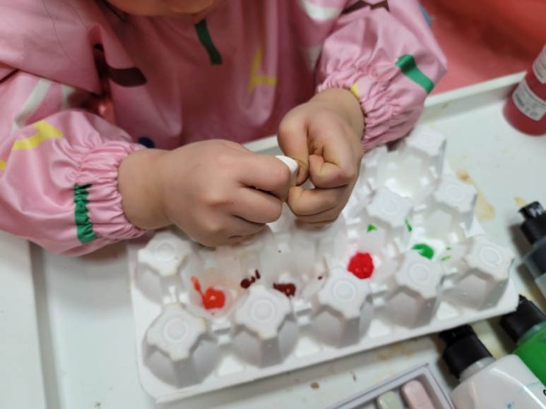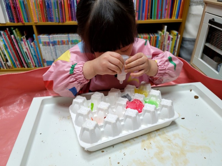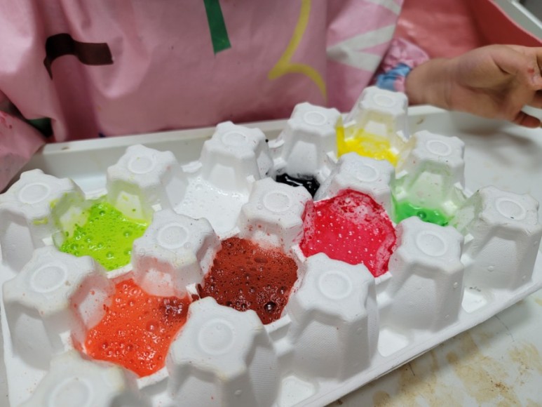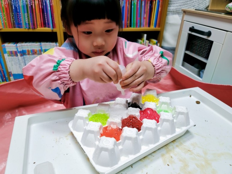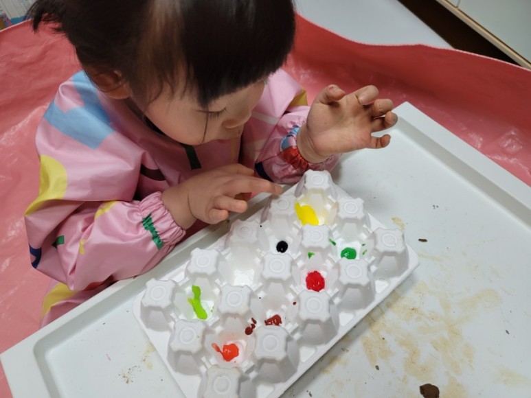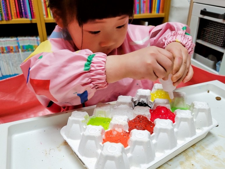 그리고 베이킹소다 위에 각각의 구멍마다 다른 색의 물감을 짜는 것, 그동안 물감을 많이 놀았는지 작은 물감은 거의 없네.초집중해서 물감을 짜다.