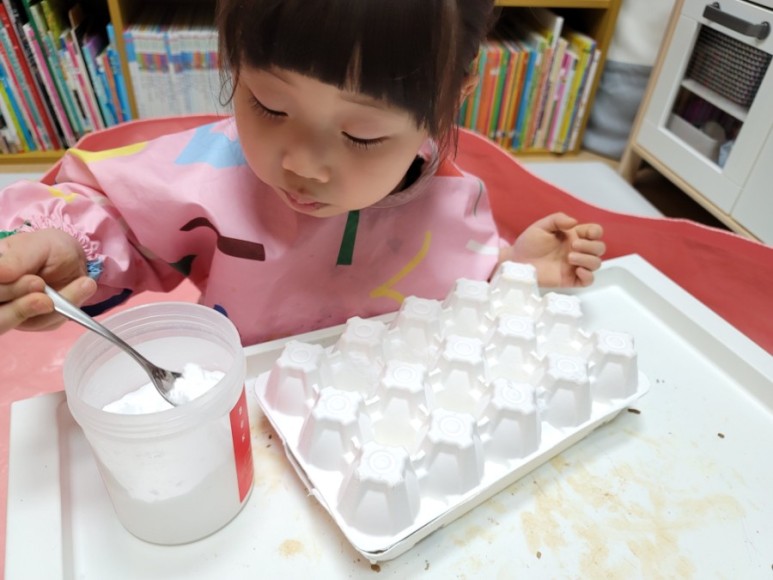 계란판에 베이킹 소다를 넣다.각 홈마다 넣으면 미니 화산 만들기에 최적!아이가 직접 해야 참여하는 맛도 나고 재미도 있어서 혼자 하도록 했다.