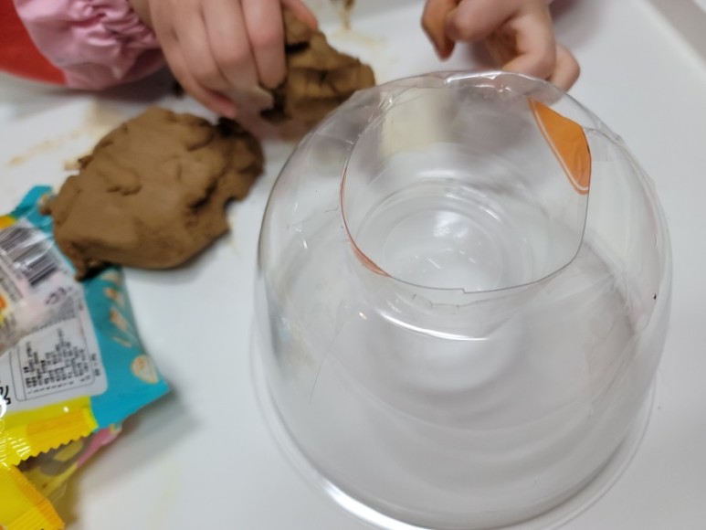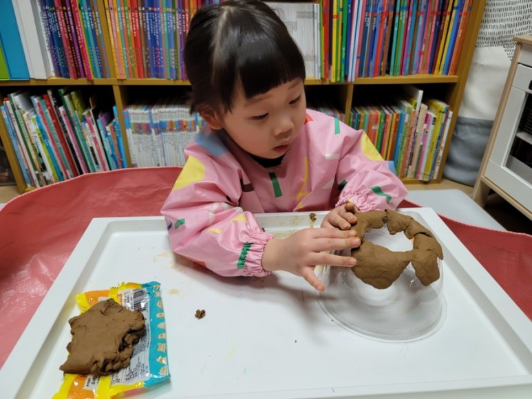 집에 미술 재료가 많아서 하얀 점토와 점토가 있었다.쿠크의 선택은 점토를 처음 보는 점토라서 궁금했던 것 같다.