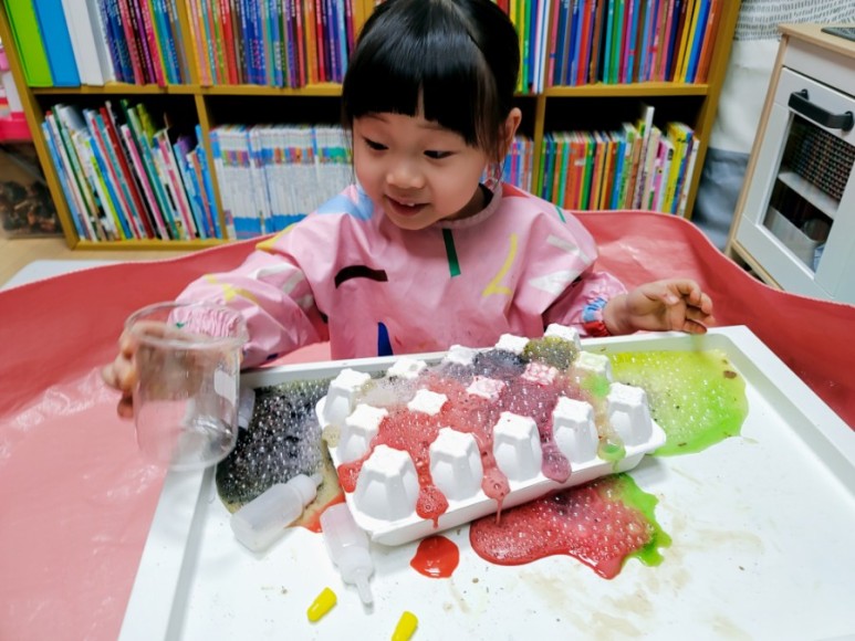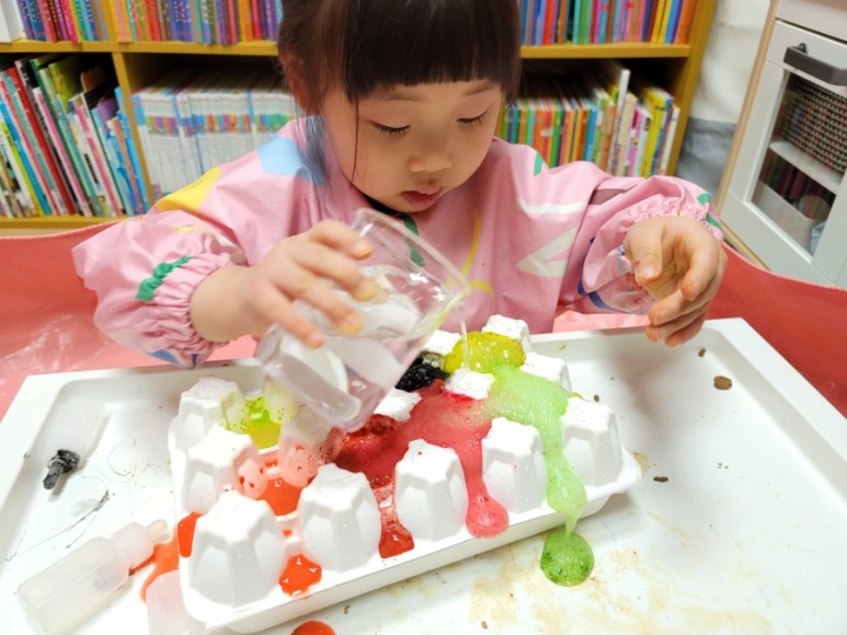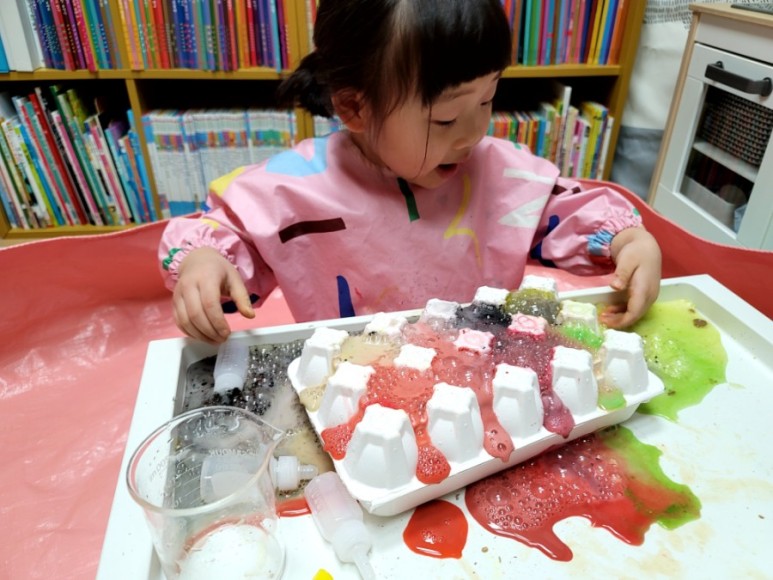즐거워. 나는 계속 구연산 만들기 때문에 손이 바빠.우리 딸은 화산 폭발 구경에 물 붓느라 바빠.우리 둘이서 아수라장을 만드는 건 순식간이야.