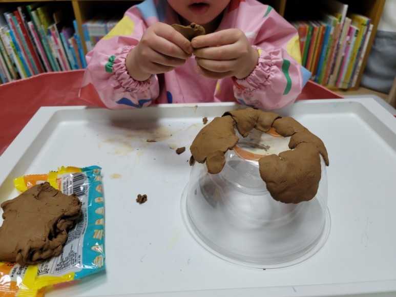 찰흙을 조금씩 떼어내어 용기에 붙여 주었다.
