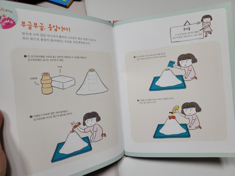 지난 토요일 그동안 고대하던 화산놀이에 도전했다.이때는 과학공룡화산을 읽기 전이었는데 나중에 찾아보면 지진과 화산 관련 책이 있다는 것!뒤의 독후활동도 내가 했던 것과 비슷했다.미리 봤으면 크게 벌지 않고 야쿠르트병으로 만들었는데…