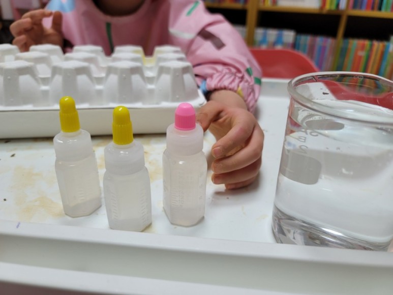 이제 구연산물만 넣으면 색화산놀이가 시작된다!! 오예!! 집에 스포이트가 없어서 딸기잼 언니의 꿀팁 약병으로 만들어봤다.우선 약병 3병 준비! 그리고 옆에 비커도 같이 준비했다.답답할 때 펑펑 쏟아지라고…(웃음)