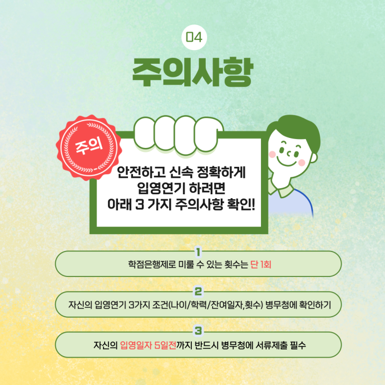 본인의 입영 연기 조건은 반드시 관할 지방병무청에 직접 연락하여 확인해야 하며,