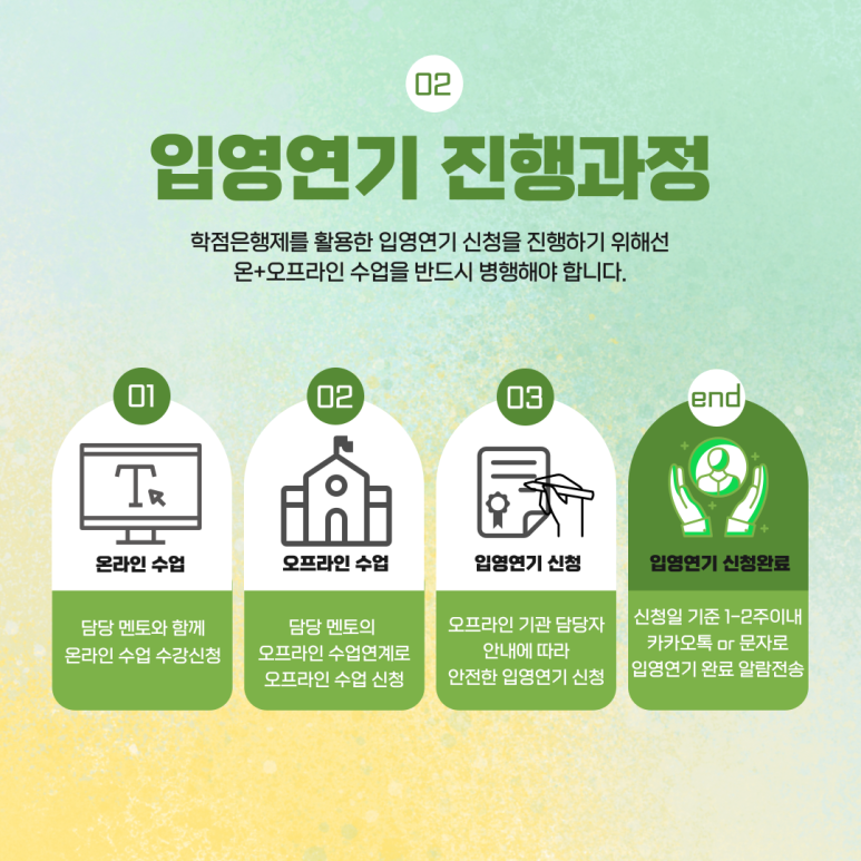 군대 연기 사유 & 학습과정 및 유의사항 단위 은행제로 입영 연기 신청을 하시려면 온라인 수업과 오프라인 수업을 반드시 병행하시기 바랍니다.