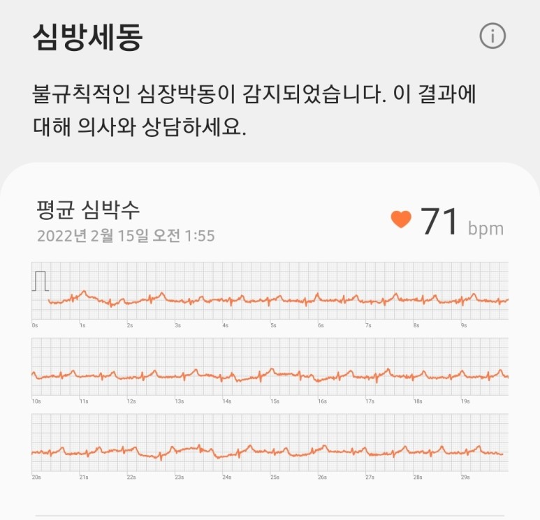 2월 15일 새벽에는 그 증상이 특히 심해서 갤럭시 워치에는 심방 세동이 나왔습니다.