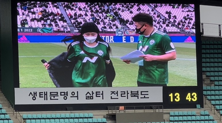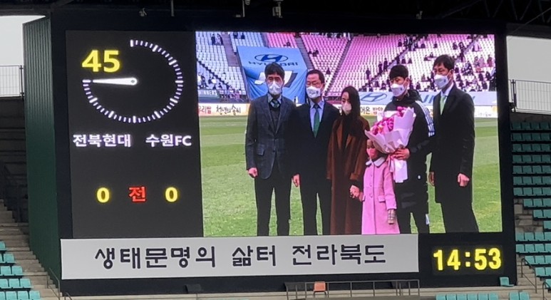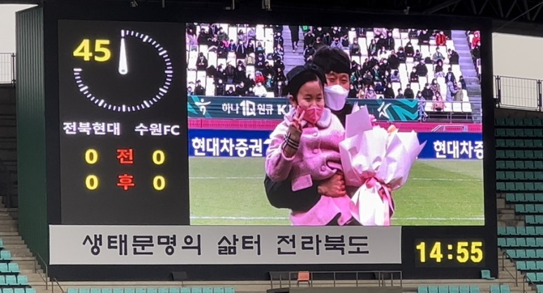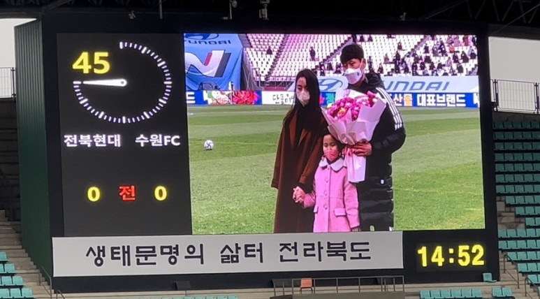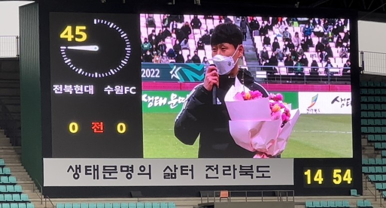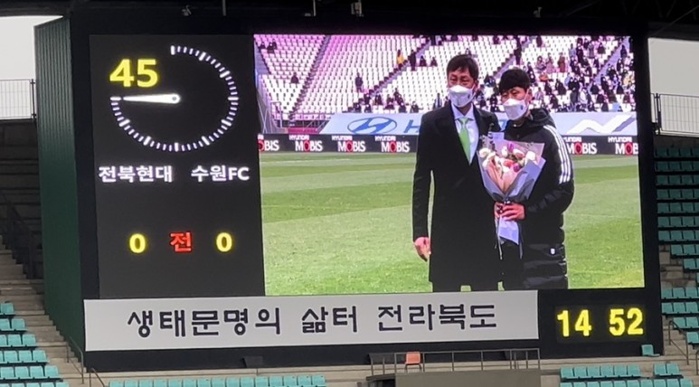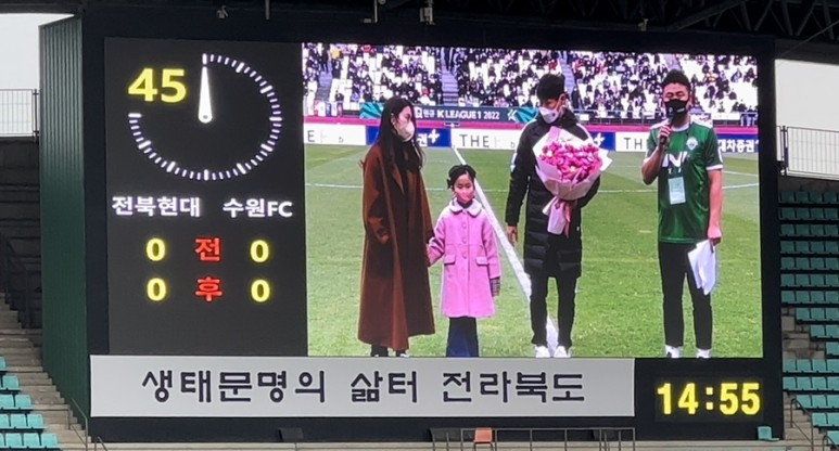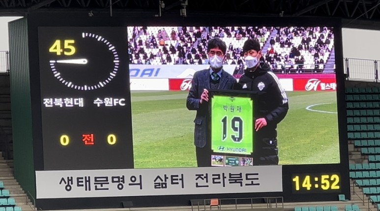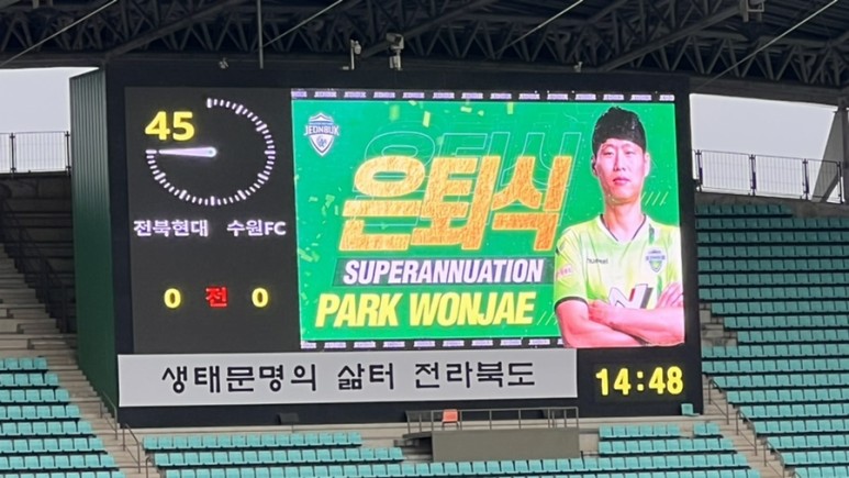 ? 전반 종료 후 하프타임 2010년 ~ 2019년 사이 전북 현대 공격수 박원재 선수의 은퇴식! 2020년에는 전북 현대 선수 겸 플레잉 코치로 그리고 2021년부터 전북 현대의 정식 코치인 당신을 응원합니다.