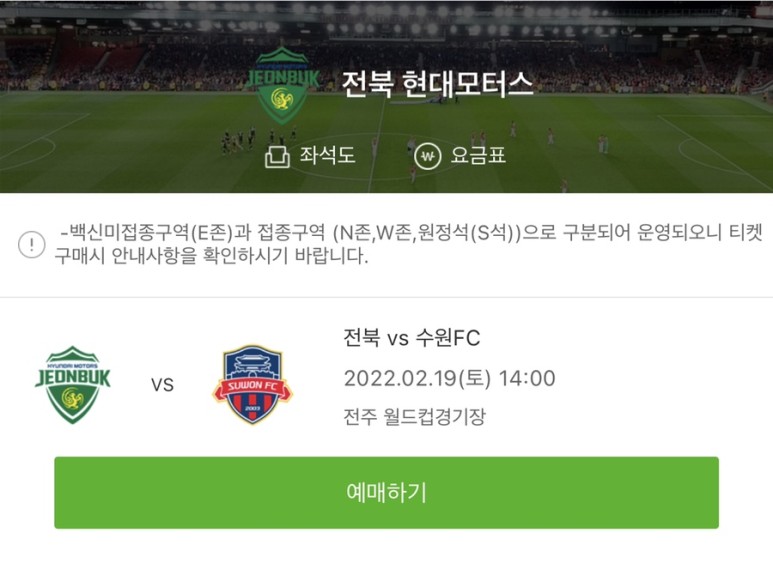 백신 백신 미접종구역(E석) 50% 입장 ? 접종구역(N석, W석, 원정석(S석)) 100% 입장