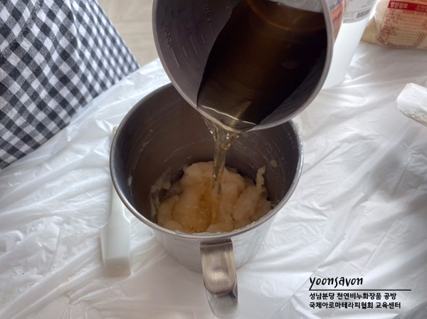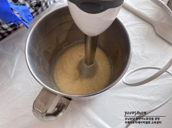 액체비누를 만들고 있는 승*수강생 🙂 액체비누는 가성소다가 아닌 가성칼리를 이용하여 만들되 액체로 변하려는 성질을 이용하여 만듭니다.완전한 물이 아닌 젤리와 같은 텍스쳐의 페이스트를 만듭니다.