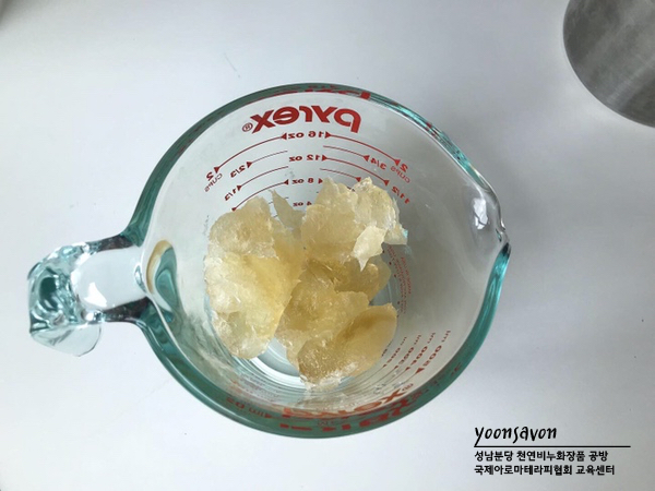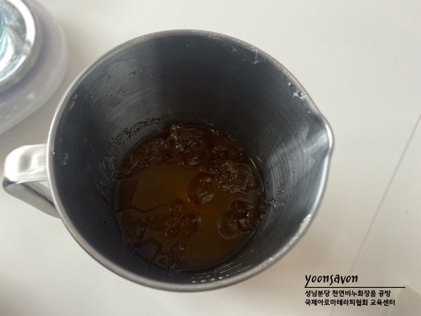 왼쪽 사진처럼 비누화 반응이 끝나면 설탕, 글리세린을 섞은 물을 붓고 일주일 정도 방치하면 오른쪽은 사진처럼 투명하고 농도 좋게 변해요!