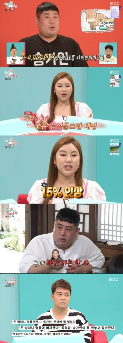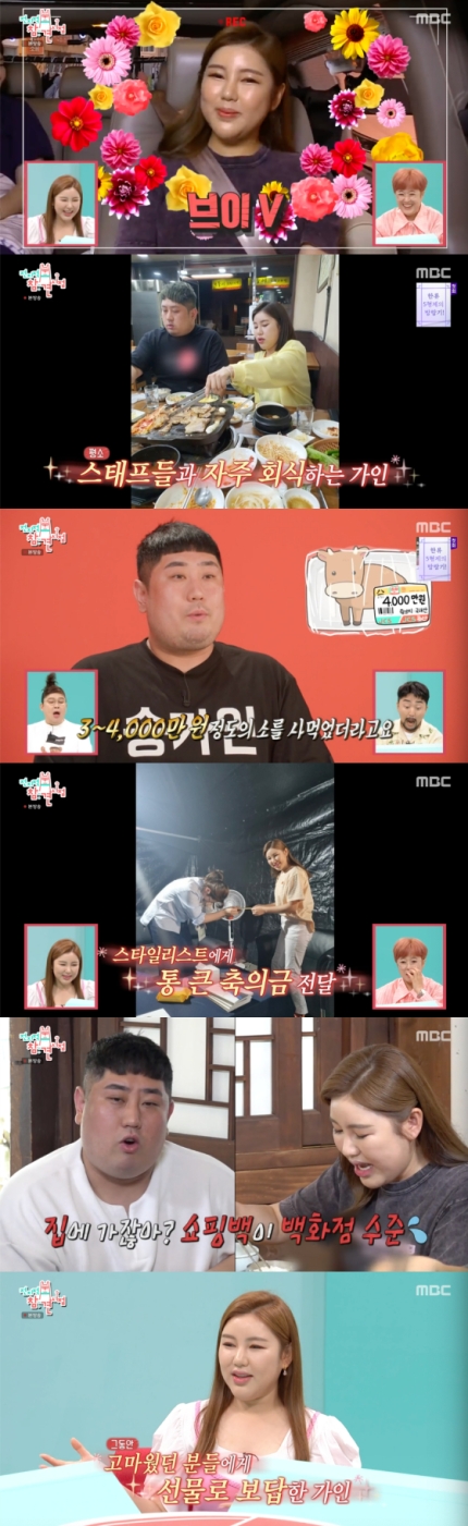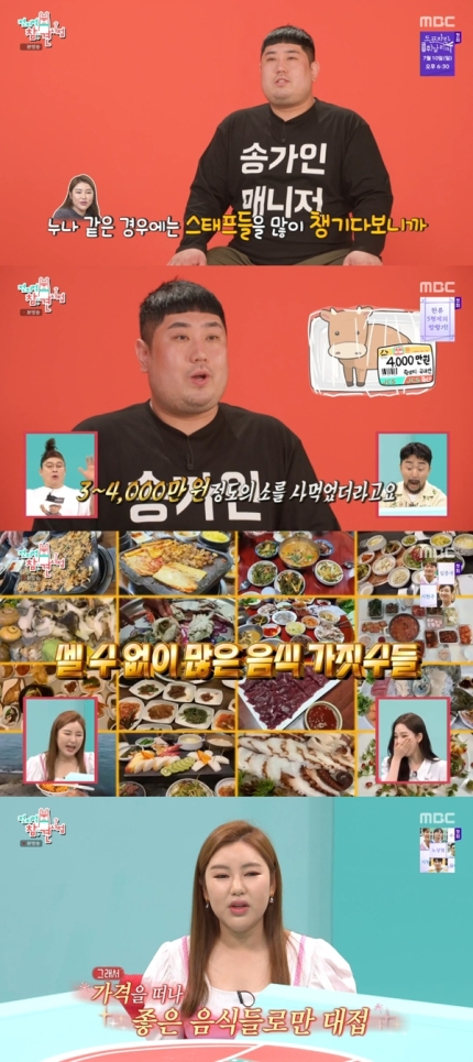 스태프들을 위해 쇠고기를 아낌없이 샀다고 밝혔다. 송가인이 우리 스태프들처럼 잘 먹는 사람도 없을 것이다. 우리는 쇠고기가 대부분 주식”이라고 말하자 매니저는 3~4개월 만에 쇠고기 가격만 3~4천만원이 나왔다고 해 놀라움을 안겼다. 이에 송가인은 “매니저들이 김밥, 라면 먹는 걸 볼 수 없었다”고 말했다.