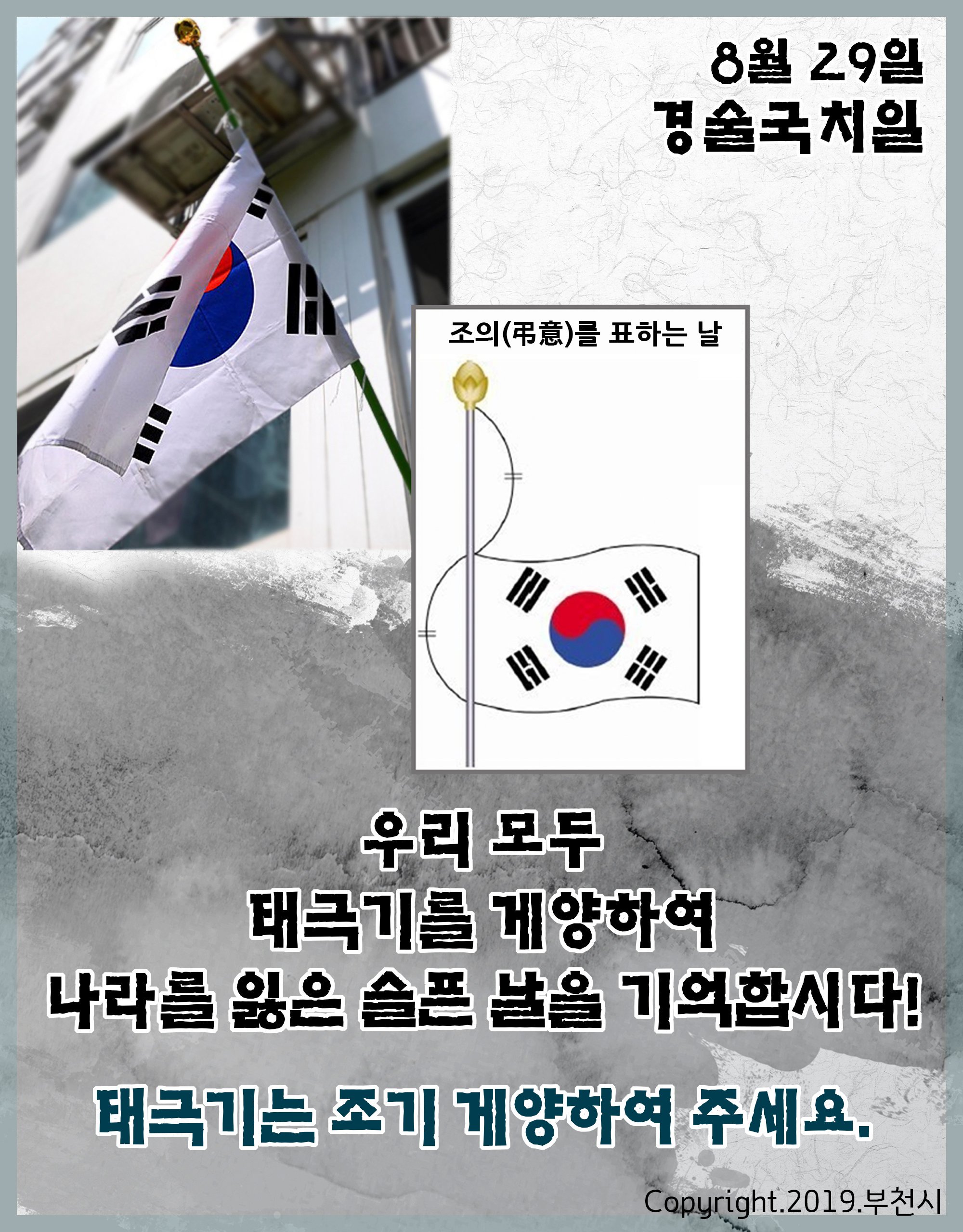 만약 차량이나 보행자 통행에 지장을 줄 우려가 있거나 깃대가 짧아 조기에 게양할 수 없는 경우에는 조기임을 알 수 있는 정도만 최대한 내려 게양하면 되는데요.당일 심한 눈이나 바람 등으로 국기가 훼손될 우려가 있는 경우 별도로 게양하지 않습니다.가정에서의 국기 게양 위치단독주택 문과 연립주택 각 세대의 난간 밖에서 바라봤을 때 중앙이나 왼쪽에 게양합니다.주택 구조상 부득이한 경우 위치를 바꿀 수 있습니다. 어린이와 함께 달거나 내릴 때 안전사고에 주의하세요! 아파트 등 고층건물에서는 강풍 등으로 난간에 단 태극기가 떨어질 수 있으니 사고로 이어지지 않도록 주의하세요!주택 구조상 부득이한 경우 위치를 바꿀 수 있습니다. 어린이와 함께 달거나 내릴 때 안전사고에 주의하세요! 아파트 등 고층건물에서는 강풍 등으로 난간에 단 태극기가 떨어질 수 있으니 사고로 이어지지 않도록 주의하세요!국기 구입처의 각 지자체 민원실, 인터넷우체국 또는 인터넷 태극기 판매업체 등에서 구입할 수 있습니다.▼ 인터넷 우체국 바로가기 ▼인터넷우체국 prev pause next 1/7 배송조회 MOREENGLISH 등기번호로 조회 고객정보로 조회 전화번호로 조회 영수증번호로 조회 국내/국제우편요금조회 우체국 상품쇼핑축하카드 우표알뜰폰 www.epost.go.kr인터넷우체국 prev pause next 1/7 배송조회 MOREENGLISH 등기번호로 조회 고객정보로 조회 전화번호로 조회 영수증번호로 조회 국내/국제우편요금조회 우체국 상품쇼핑축하카드 우표알뜰폰 www.epost.go.kr절대 반복되어서는 안 될 우리나라의 아픈 역사를 되새기고 8월 29일 경술국치일 조기 게양에 모두 함께 참여해 주시기 바랍니다!서울시 블로그 이웃에게 드리는 꿀 TIP, 지금 서울시 블로그에서는 9월 2일까지 <남산골 한옥마을> 무료 한복 착용 체험 이벤트를 진행하고 있습니다!블로그 이웃이라면 남산골 한옥마을 전통체험 프로그램도 보고 무료 한복 착용 체험도 놓치지 마세요~!▼ 이벤트 참여 바로가기 ▼서울시 블로그 이벤트와 함께하는 남산골 한옥마을 전통체험 프로그램 총정리! 다가오는 추석! 9월에 추석 분위기를 즐길 수 있는 전통 체험 프로그램이 많이 있다고? 남산기슭 아…blog.naver.com서울시 블로그 이벤트와 함께하는 남산골 한옥마을 전통체험 프로그램 총정리! 다가오는 추석! 9월에 추석 분위기를 즐길 수 있는 전통 체험 프로그램이 많이 있다고? 남산기슭 아…blog.naver.com서울시 블로그 이벤트와 함께하는 남산골 한옥마을 전통체험 프로그램 총정리! 다가오는 추석! 9월에 추석 분위기를 즐길 수 있는 전통 체험 프로그램이 많이 있다고? 남산기슭 아…blog.naver.com서울시 블로그 이벤트와 함께하는 남산골 한옥마을 전통체험 프로그램 총정리! 다가오는 추석! 9월에 추석 분위기를 즐길 수 있는 전통 체험 프로그램이 많이 있다고? 남산기슭 아…blog.naver.com