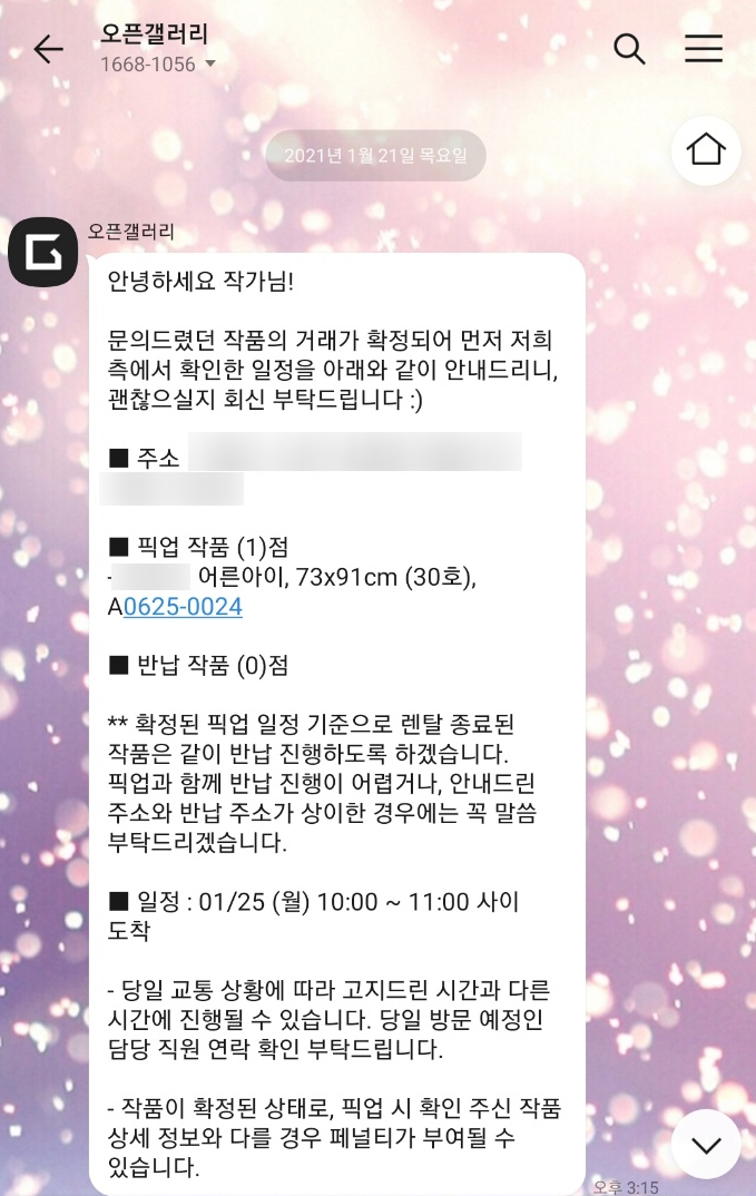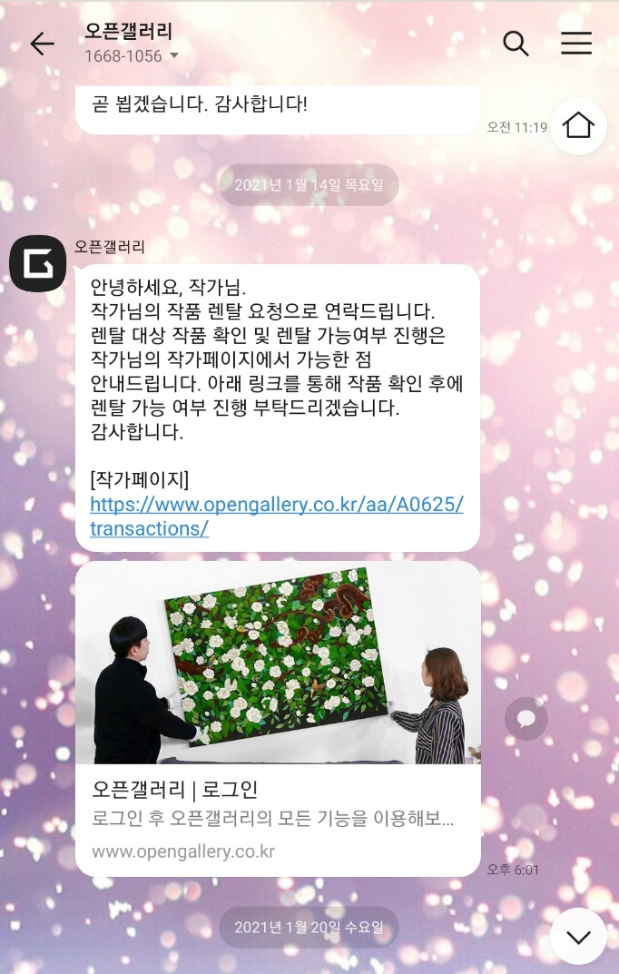 새해 1월부터 오픈갤러리로부터 그림 대여 신청이 들어온 지난해에 이어 잇달아 그림 대여 소식이 들려왔다. 이미 오픈갤러리와 작가 계약을 한 지 올해로 4년이 된다. 총 2점이 1회씩 다른 날에 공지를 듣고 픽업 되어 현재 렌탈중이다.작가그림을 포기하지 않고 그려야 하는 것이 숙명임을 알지만 붓을 들 때까지 많은 생각이 오간다.꾸준히 그림을 그리며 전시를 준비해 나가야 하고 앞으로 나아갈 길은 무궁무진함을 매번 느낀다.생각이 많아질 때 그 어느 때보다도그리고 그에 대한 막중한 책임감을 항상 느낀다. 작가라는 이름으로
