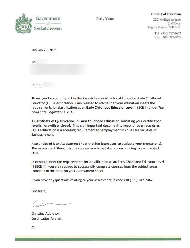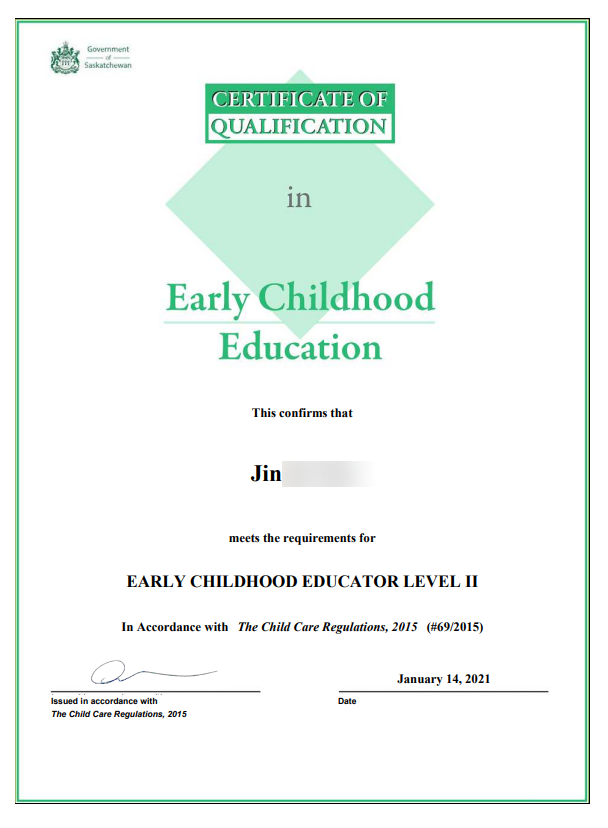 2021년 새해 소식으로 캐나다 SK주 ECE Level2 자격증을 취득하게 되었다 🙂