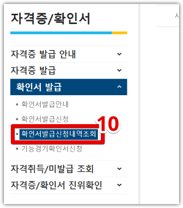(10) 확인서 발급 신청 내역 조회 메뉴를 클릭합니다.