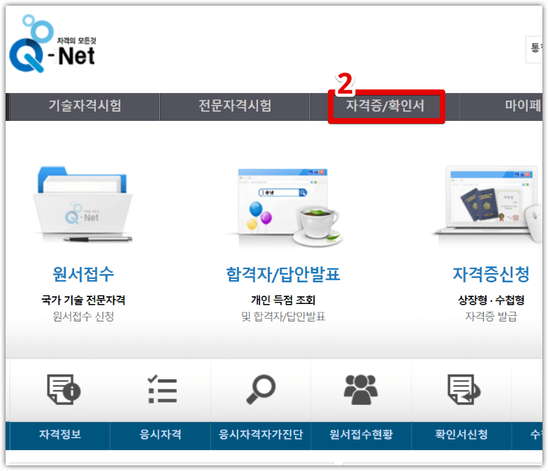 (2) 상단의 자격/확인서 메뉴를 클릭합니다.
