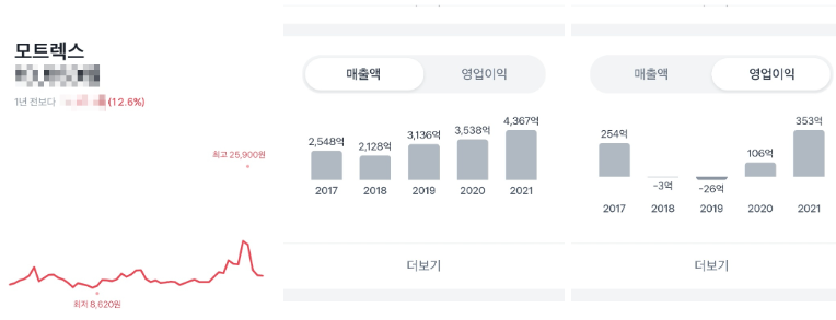 모토렉스 주가는 최근 1년간 12.6% 올랐는데요.매출액은 2017년 2,548억원에서 2018년 2,128억원으로 감소한 이후 매년 꾸준히 증가하여 2019년 3,136억원, 2020년도에는 3,538억원으로 증가하였고 2021년도에는 4,367억원을 기록하였습니다. 영업이익은 2017년 254억원에서 2018년 -3억원으로 적자전환됐다가 2019년도에 -26억원으로 악화됐고 이후 지속적인 성장세가 이어지면서 2020년 106억원으로 흑자전환에 성공, 2021년도에 353억원을 달성했습니다. 2022년 1분기 실적은 매출액 1,309억원(전년 동기 1,094억원), 영업이익 98억원(전년 동기 87억원)을 기록했습니다.