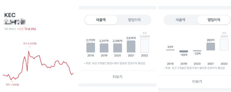 KEC 주가는 지난 1년간 4.9% 올랐는데요.매출액은 2018년 2,173억원에서 매년 소폭 감소하여 2020년 2,010억원을 기록하였고, 이후 점차 증가하여 2021년도 3,058억원, 올해는 33억원을 목표로 하고 있으며, 영업이익은 2018년 69억원에서 2019년 -23억원으로 적자 전환되었으며, 이후 매년 꾸준히 증가하여 2020년도에는 -265억원으로 회복, 2021년도에는 398억원으로 흑자 전환, 올해 추정이익은 2,674억원으로 예상하고 있습니다. 2022년 1분기 실적은 매출액 722억원(전년 동기 606억원), 영업이익 90억원(전년 동기 27억원)을 기록했습니다.