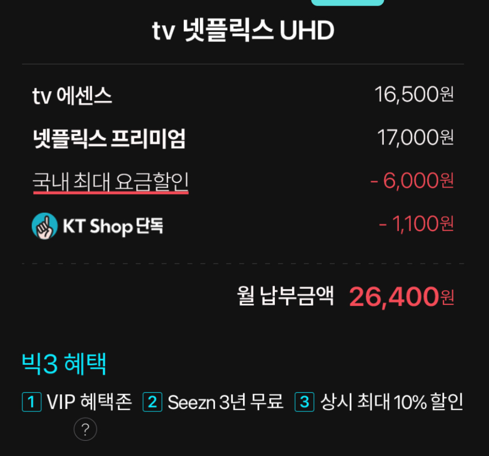 KT의 경우 TV 에센스 16.500원 요금제 선택 시 넷플릭스 할인을 프리미엄으로 적용받아 월 26.400원을 납부하게 됩니다.하지만 조금 더 많은 혜택을 받을 수 있는 방법이 있습니다.