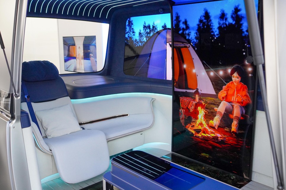 실내는 지금까지 흔히 볼 수 있던 차량과 전혀 다르게 구성되어 있습니다. 실내에서 다양한 경험을 할 수 있도록 설계, 디자인, 각종 최신기술이 접목된 Mobile Space라는 개념이 적용된 움직이는 집이나 사무실과 같은 역할을 합니다. LG 옴니팟 내에서는 일과 휴식, 여가생활까지 다양한 활동이 가능합니다.