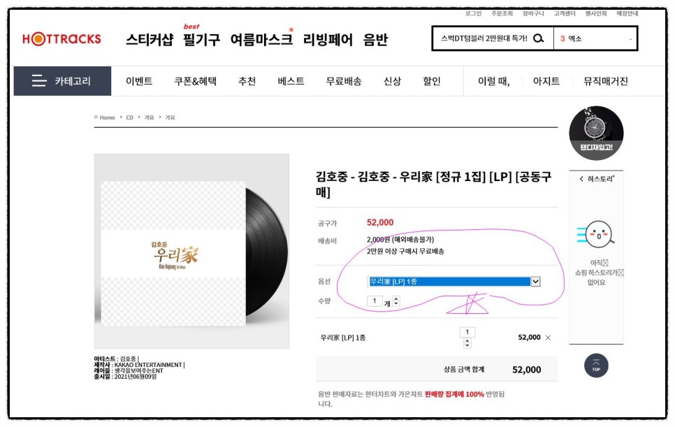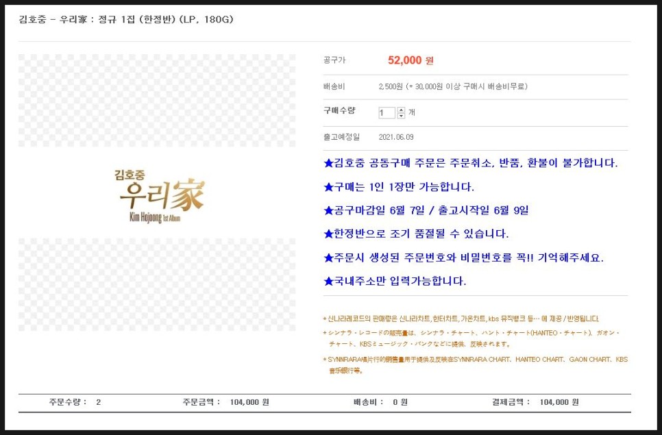 ※ 아래 링크 클릭 후 구매해주세요 ※ 신나라 온라인 구매처 (전화주문 없음) https://www.synnara.co.kr/so/grouporder.do?grouporderid=SYGO00012840&groupkey=KHJ_LP 김호준 – THE CLASSIC ALBUM (한정반) (LP,180G) 공구가 52,000원 배송비 2,500원 (*30,000원 이상 구매시 무료배송) 구매수량 개 출고예정일 ★구입은 1인당 1매만 가능합니다. ★공구마감일6월7일 / 출고 개시일 6월9일 ★한정반으로 조기 품절 될 수 있습니다. ★ 주문시 생성된 주문번호와 비밀번호를 꼭!! 기억해두세요. ★ 국내 주소만 입력 가능합니다. * 신나라레코드의 판매량은 신나라차트, 헌트차트… www.synnara.co.kr 주소를 클릭하시면 신나라레코드는 아래와 같습니다.