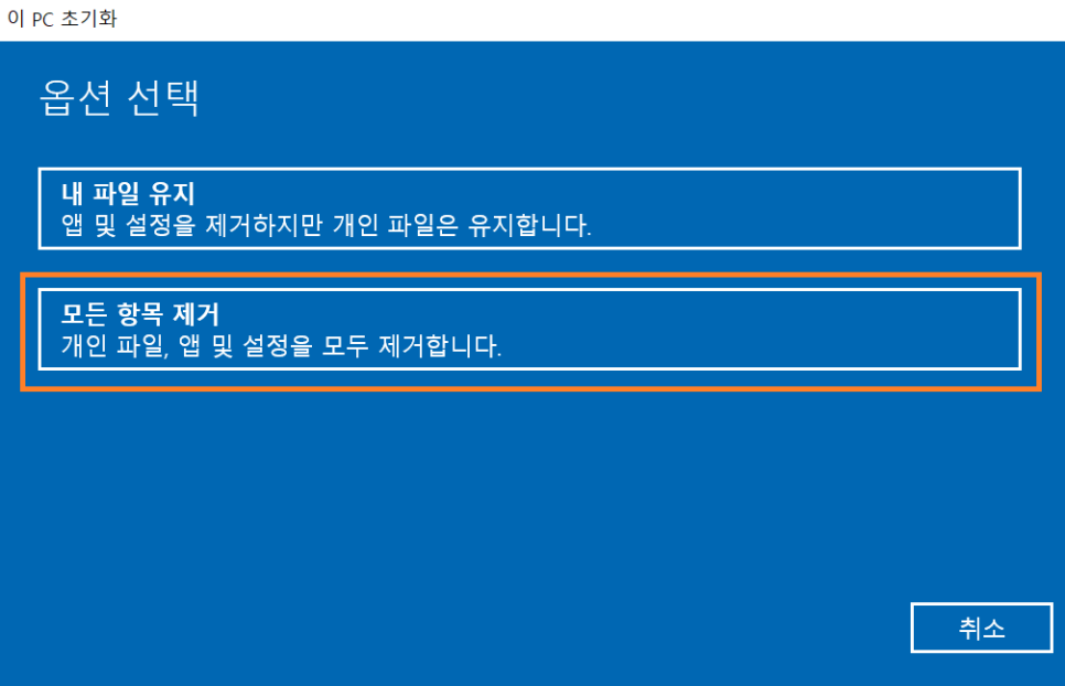 ‘내 파일 유지’와 ‘모든 항목 제거’ 버튼이 있는 게 보이실 겁니다.’내 파일 유지’는 캐시 파일이나 로그 파일만 삭제하는 것이기 때문에 포맷으로서 큰 의미가 없다고 할 수 있습니다.우리는 “모든 항목 제거” 기능을 이용하여 Windows 10 포맷을 진행합니다.