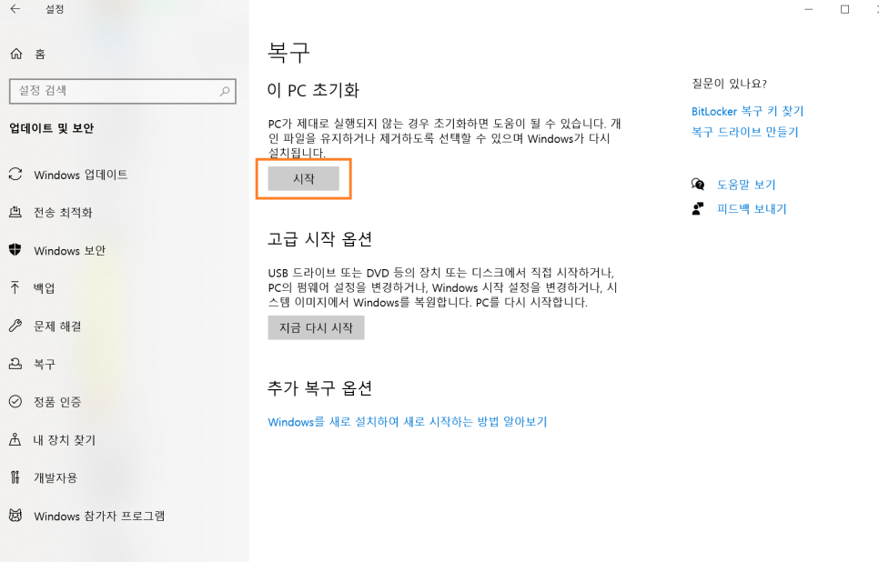 복구화면에 들어가서 ‘이 PC 초기화’ 기능을 사용해 보세요!시작 버튼을 클릭해주세요.