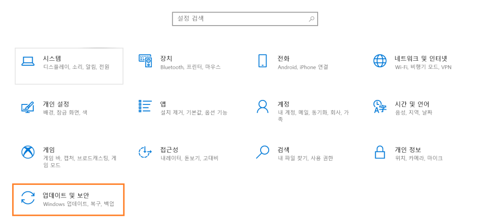 시작메뉴를 열고 톱니바퀴 버튼을 누르면 창 설정화면에 접속할 수 있습니다.설정 화면에서 ‘업데이트 및 보안’이라고 적힌 카테고리를 더블 클릭해주세요!