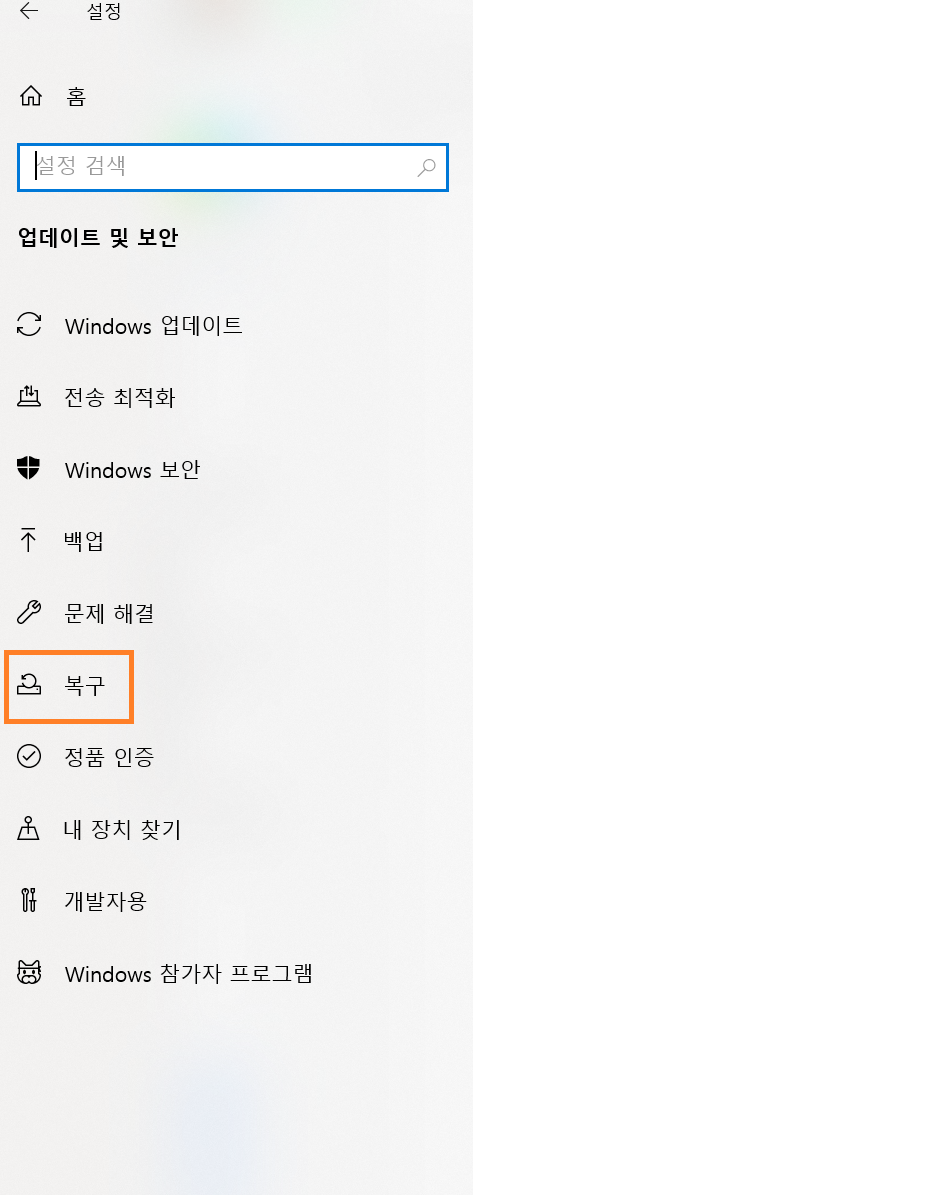 이렇게 “Windows 업데이트”로 접속하시면 다양한 기능을 보실 수 있습니다.오늘 소개해드릴 컴퓨터 포맷과 비슷한 기능은 복구와 관련된 부분이니 복구 버튼을 눌러주세요.